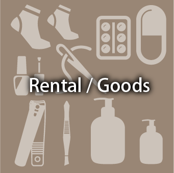 常備薬、爪切り・毛抜き、ソーイングセット、除光液などの日常品を無料貸出しております。また、急な宿泊時などに必要な、下着、ストッキング、靴下、コンタクト保存液などを 取り揃え、販売しています。