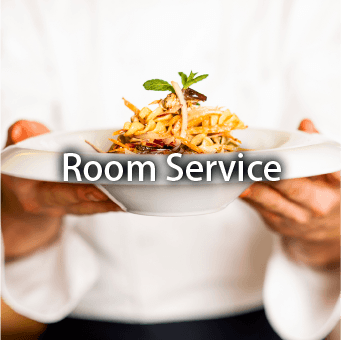 24時間対応でルームサービスを承っております。パスタ、カレー、ピザ、チャーハンやポテトや枝豆などのおつまみ、デザートなどバラエティーに取り揃えました。更にメンバー様には特別価格でご提供しております。